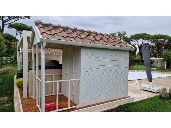 Cabina in legno con veranda modello Forte dei Marmi posizionata in giardino