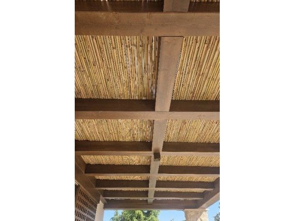 Realizzazione di veranda con travi in legno abete lamellare, copertura in policarbonato e doppio strato di arella passante per l'effetto ombra