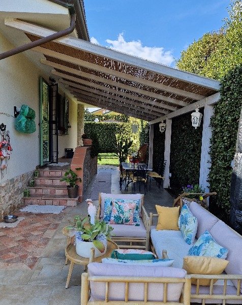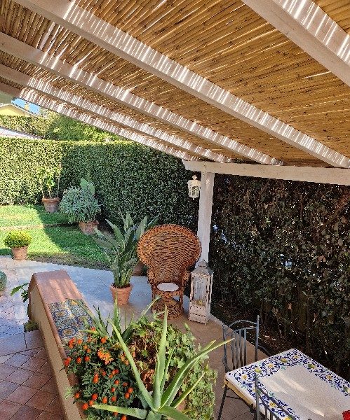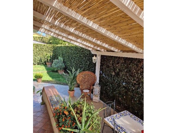 Relizzazione di veranda in legno abete lamellare con copertura in policarbonato e doppio strato di arella passante