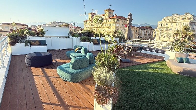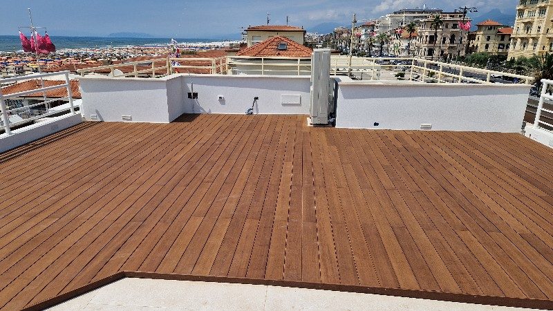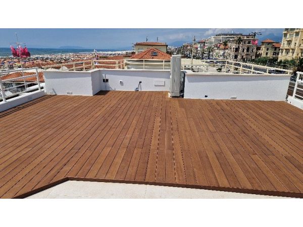 Pavimentazione di un attico realizzata in doghe di bamboo preoliato su 4 facce montato con sistema che lo rende totalmente ispezionabile, inoltre non ci sono fessure per cui non si vede la struttura sottostante e niente puņ andare al di sotto delle doghe