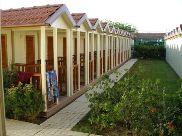 Struttura con pavimento in legno teak, cabine con in mezzo pergolato e veranda a lato.
