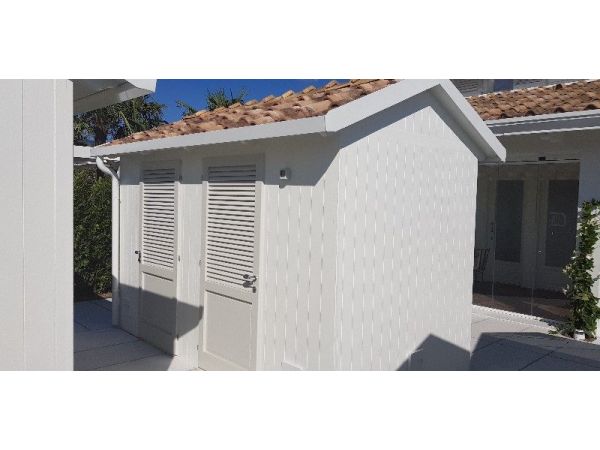 Cabina in legno doppia. Realizzata su misura per ogni richiesta. Quella in foto è stata costruita per la realizzazione di servizi igienici; all'esterno il pavimento è in legno e all'interno in muratura con mattonelle.